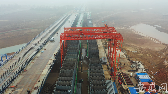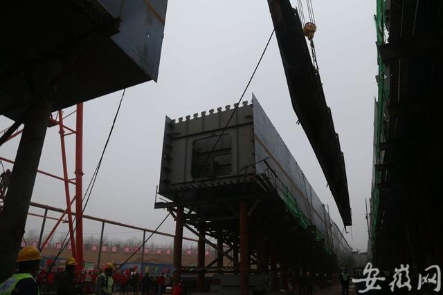 由于引江济淮工程与G312合六叶公路相交,需新建一座公路桥跨越江淮运河。记者在现场看到,大桥雏形已现,工人们正在紧张施工。“G312合六叶公路桥全长280米,总用钢量达1.6万吨,桥面总宽52.5米,最大跨度达180米、采用钢箱梁结构,在同类钢箱梁中主跨跨度居全国第二、安徽省第一。”中铁五局引江济淮项目负责人罗伟平介绍,钢箱梁由四幅连续梁组成,每幅钢箱梁采用100米+180米+100米的三跨结构组成,其中3#、4#连续梁已于2020年4月份实现合龙。