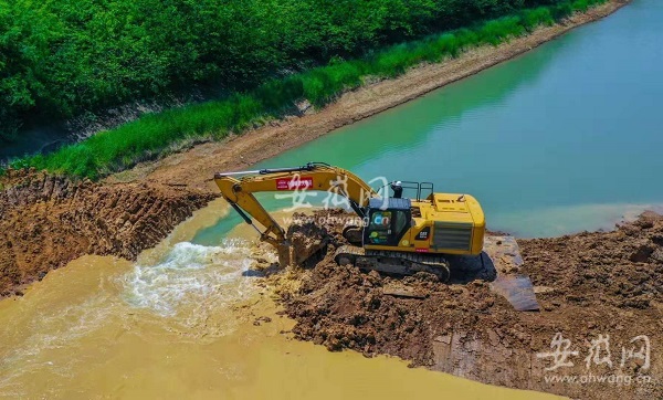 记者在施工现场看到,随着数台挖掘机挖开淠河总干渠的拦水围堰,淠河总干渠的水缓缓流进渡槽,“改道”渡槽,正式上跨引江济淮运河。