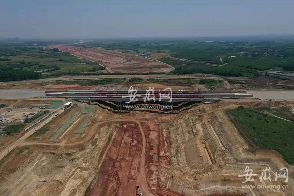 据介绍,淠河总干渠渡槽工程由中铁四局和中国铁建大桥局联合承建,是引江济淮重大节点工程。渡槽总长 350 米,分左右两幅,其中钢渡槽全长246 米,总用钢量达 2.1 万吨。设计流量150立方米每秒,设计水深4.0米,为Ⅵ级航道,通行100吨级船舶。桥跨布置采用 68 米 +110米 +68 米的三跨钢结构桁架式梁拱组合设计,主跨跨度达 110 米,是目前世界上单跨最大的通水通航钢结构渡槽。渡槽下部为引江济淮Ⅱ级航道,两航道高差约30米。