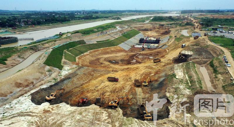 2020年8月7日,航拍引江济淮工程安徽省合肥市庐江县万山镇永桥村庐江船闸施工现场一片繁忙景象。