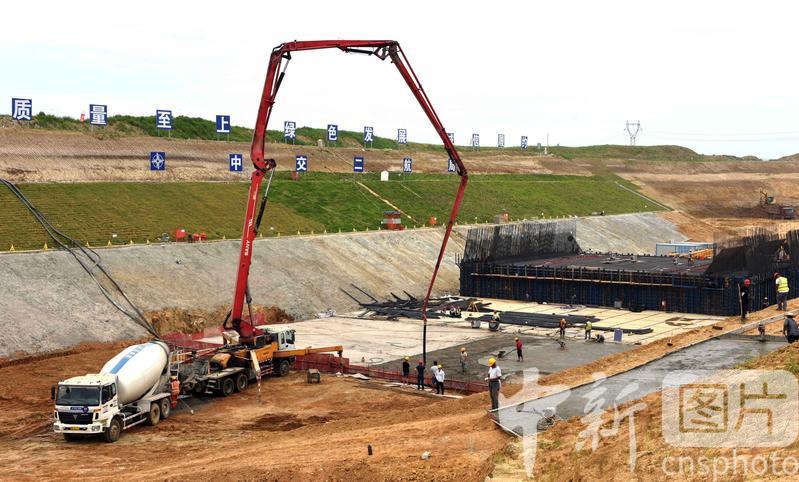 在引江济淮工程安徽省合肥市庐江县万山镇永桥村庐江船闸施工现场,中交第二航务工程局有限公司的建设者们正在施工庐江船闸闸室底板垫层混凝土浇筑。