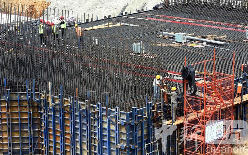 在引江济淮工程安徽省合肥市庐江县万山镇永桥村庐江船闸施工现场,中交第二航务工程局有限公司的建设者们正在施工庐江船闸主体底板钢筋结构。