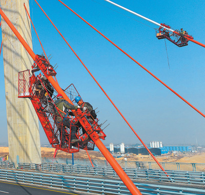 工人在位于安徽省合肥市庐江县的引江济淮文昌西路大桥上安装斜拉索防护带。