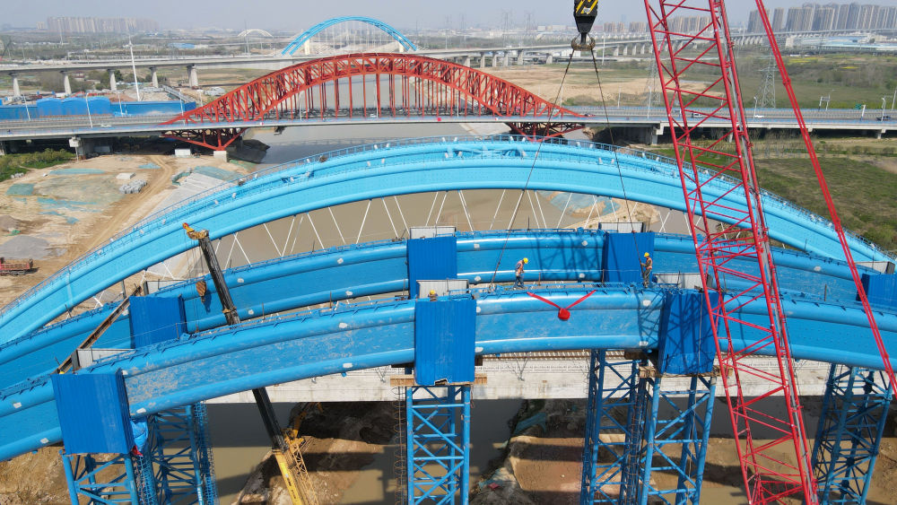 ↑这是中铁四局引江济淮合九铁路改建工程特大桥系杆拱合龙施工现场(4月2日摄)。新华社记者 刘军喜 摄影报道