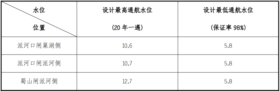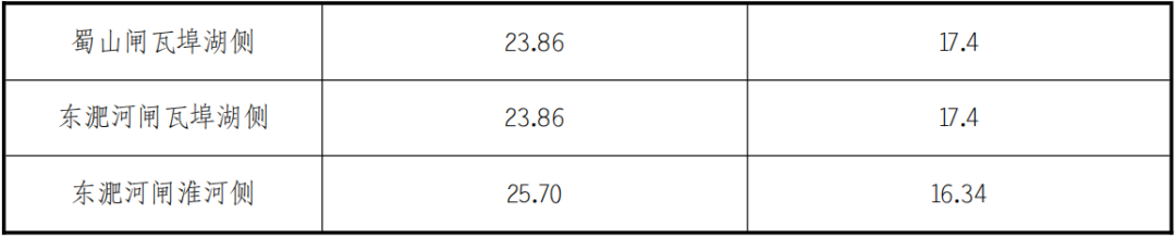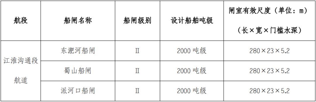 东淝河、蜀山、派河口船闸级别均为Ⅱ级,设计船舶吨级为2000吨级,闸室有效尺度280×23×5.2m(长×宽×门槛水深)。