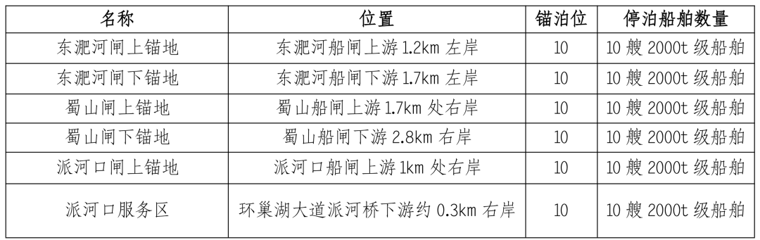 工程沿线建有5个锚地,分别为东淝河闸上、闸下锚地,蜀山闸上、闸下锚地,派河闸上锚地。