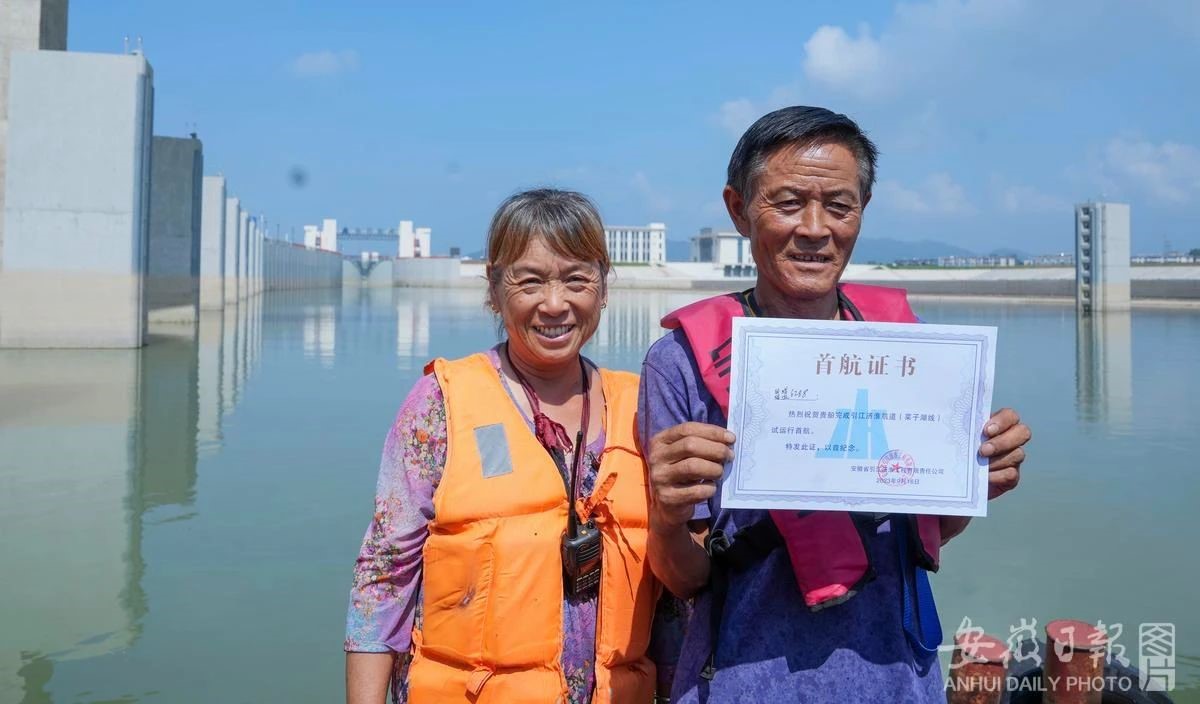 当天上午,记者来到了引江济淮枞阳船闸。10时58分,伴着汽笛鸣响,装载680吨钢材的“昌盛6288”号散货船由枞阳小港航道向北,缓缓驶过枞阳船闸,进入引江济淮菜子湖线。作为航道试运行通过枞阳船闸的首艘货轮,安徽省引江济淮工程有限责任公司为其颁发了“首航证书”。