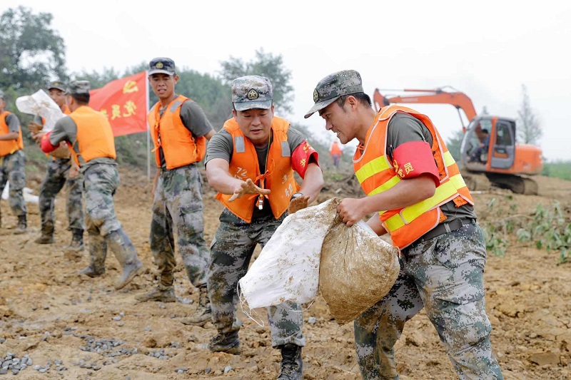 7月22日,严店乡莲花圩内的派河大堤出现滑坡险情,对圩内的的省一号工程引江济淮泵站构成严重威胁。危急时刻,解放军72集团军某部官兵紧急支援派河大堤抢险。